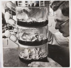 A laboratory technician examining flasks of penicillin culture, taken by James Jarche for Illustrated magazine in 1943.